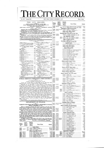The City Record newspaper publishes notices which includes but is not limited to: public hearings and meetings, public auctions and sales, solicitations and awards and official rules proposed and adopted by city agencies. This is the City Record Newspaper for December 11, 1917.