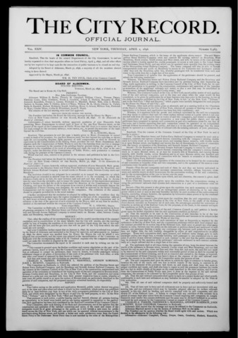 The City Record newspaper publishes notices which includes but is not limited to: public hearings and meetings, public auctions and sales, solicitations and awards and official rules proposed and adopted by city agencies. This is the City Record Newspaper for April 02, 1896.