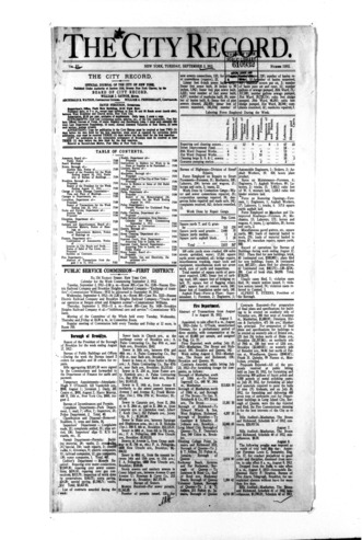 The City Record newspaper publishes notices which includes but is not limited to: public hearings and meetings, public auctions and sales, solicitations and awards and official rules proposed and adopted by city agencies. This is the City Record Newspaper for September 03, 1912.