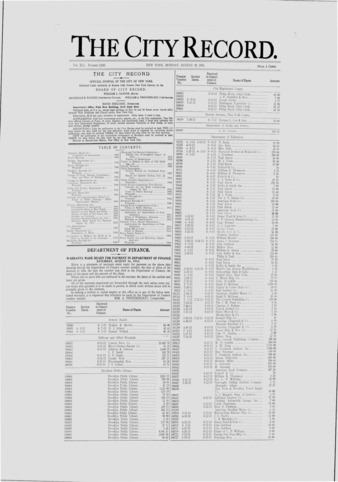 The City Record newspaper publishes notices which includes but is not limited to: public hearings and meetings, public auctions and sales, solicitations and awards and official rules proposed and adopted by city agencies. This is the City Record Newspaper for August 18, 1913.
