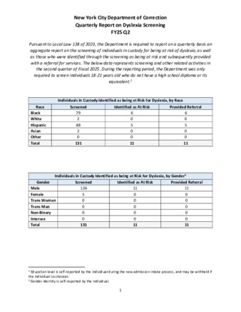 Pursuant to Local Law 138 of 2023, this report provides information regarding dyslexia screening and referrals for enrollment in evidence-based intervention programs in city jails.