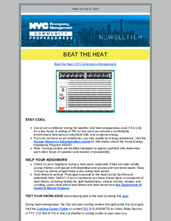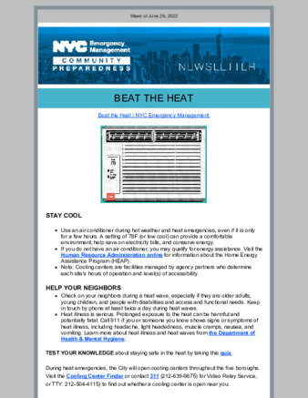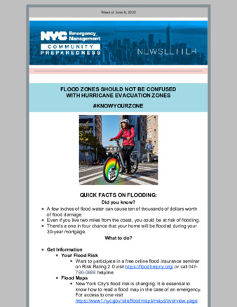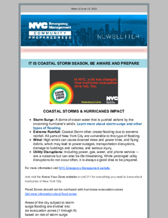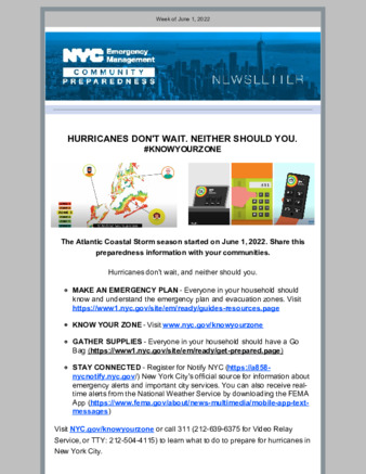 The NYCEM Community Preparedness newsletter provides information about preparedness initiatives, resources and local events to community and faith-based organizations, leaders and the general public of New York City. During emergencies, important alerts and updates are issued to all who subscribe.