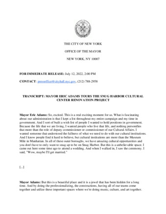 TRANSCRIPT: MAYOR ERIC ADAMS TOURS THE SNUG HARBOR CULTURAL CENTER RENOVATION PROJECT