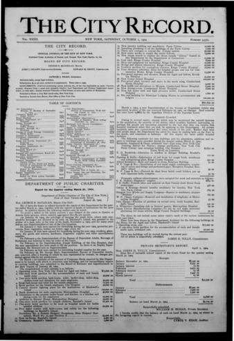 The City Record newspaper publishes notices which includes but is not limited to: public hearings and meetings, public auctions and sales, solicitations and awards and official rules proposed and adopted by city agencies. This is the City Record Newspaper for October 01, 1904.