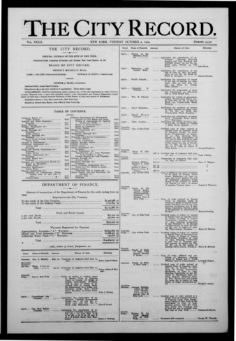 The City Record newspaper publishes notices which includes but is not limited to: public hearings and meetings, public auctions and sales, solicitations and awards and official rules proposed and adopted by city agencies. This is the City Record Newspaper for October 04, 1904.