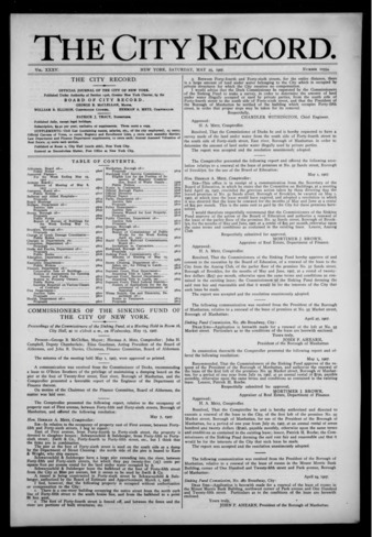 The City Record newspaper publishes notices which includes but is not limited to: public hearings and meetings, public auctions and sales, solicitations and awards and official rules proposed and adopted by city agencies. This is the City Record Newspaper for May 25, 1907.
