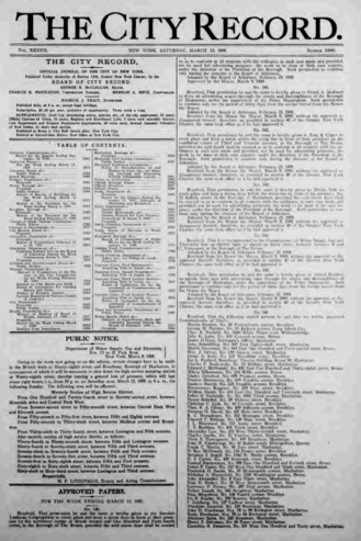 The City Record newspaper publishes notices which includes but is not limited to: public hearings and meetings, public auctions and sales, solicitations and awards and official rules proposed and adopted by city agencies. This is the City Record Newspaper for March 13, 1909.