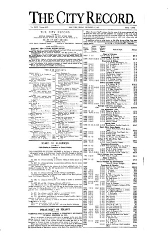 The City Record newspaper publishes notices which includes but is not limited to: public hearings and meetings, public auctions and sales, solicitations and awards and official rules proposed and adopted by city agencies. This is the City Record Newspaper for December 17, 1915.