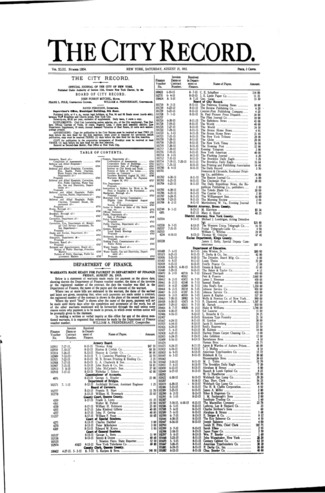 The City Record newspaper publishes notices which includes but is not limited to: public hearings and meetings, public auctions and sales, solicitations and awards and official rules proposed and adopted by city agencies. This is the City Record Newspaper for August 21, 1915.