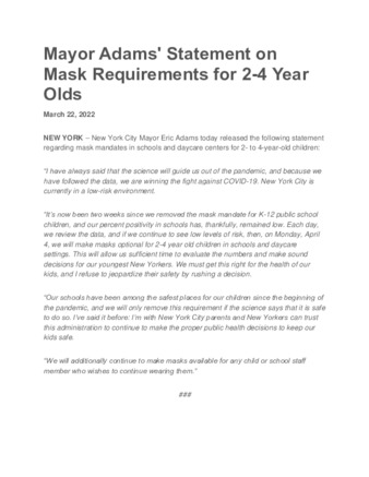 Mayor Adams' Statement on Mask Requirements for 2-4 Year Olds