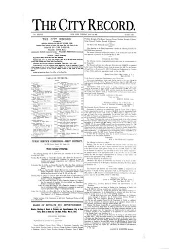 The City Record newspaper publishes notices which includes but is not limited to: public hearings and meetings, public auctions and sales, solicitations and awards and official rules proposed and adopted by city agencies. This is the City Record Newspaper for May 10, 1910.
