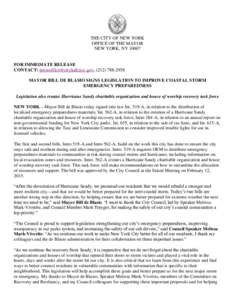 Mayor's Press Release: MAYOR BILL DE BLASIO SIGNS LEGISLATION TO IMPROVE COASTAL STORM EMERGENCY PREPAREDNESS