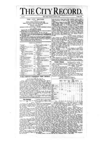 The City Record newspaper publishes notices which includes but is not limited to: public hearings and meetings, public auctions and sales, solicitations and awards and official rules proposed and adopted by city agencies. This is the City Record Newspaper for August 06, 1912.