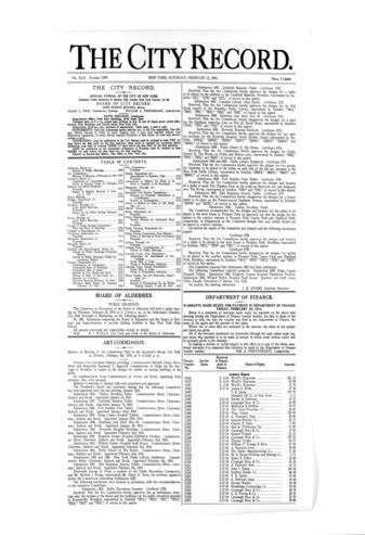 The City Record newspaper publishes notices which includes but is not limited to: public hearings and meetings, public auctions and sales, solicitations and awards and official rules proposed and adopted by city agencies. This is the City Record Newspaper for February 21, 1914.