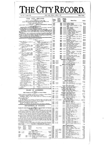 The City Record newspaper publishes notices which includes but is not limited to: public hearings and meetings, public auctions and sales, solicitations and awards and official rules proposed and adopted by city agencies. This is the City Record Newspaper for April 06, 1917.