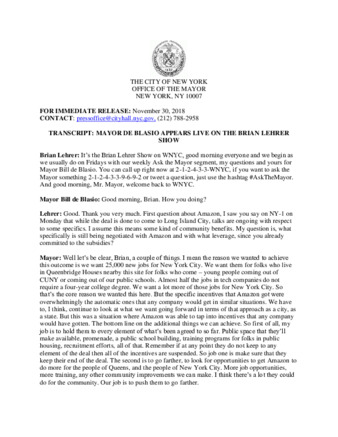 Press Release: TRANSCRIPT: MAYOR DE BLASIO APPEARS LIVE ON THE BRIAN LEHRER SHOW