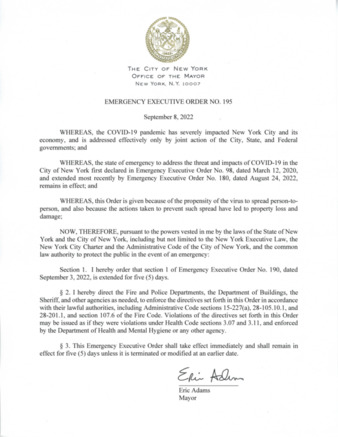 Emergency Executive Order No. 195, extends Emergency Executive Order No. 190, dated September 3, 2022, for five (5) days, if this relates to Covid-19 pandemic.