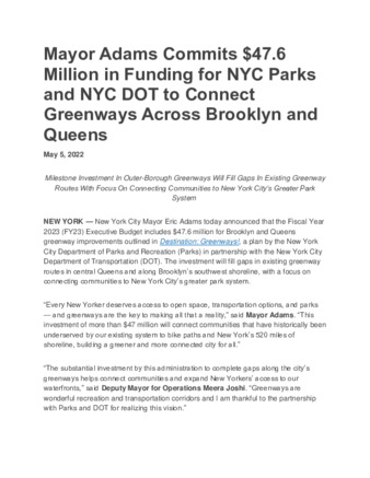 New York City Mayor Eric Adams announces that the Fiscal Year 2023 (FY23) Executive Budget includes $47.6 million for Brooklyn and Queens greenway improvements outlined in Destination: Greenways!