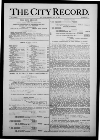 The City Record newspaper publishes notices which includes but is not limited to: public hearings and meetings, public auctions and sales, solicitations and awards and official rules proposed and adopted by city agencies. This is the City Record Newspaper for May 19, 1905.