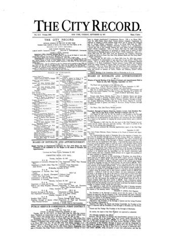 The City Record newspaper publishes notices which includes but is not limited to: public hearings and meetings, public auctions and sales, solicitations and awards and official rules proposed and adopted by city agencies. This is the City Record Newspaper for September 18, 1917.