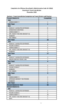 Pursuant to Admin Code Sect. 14-150(d), this monthly report contains information on complaints and arrests for violent felony offenses, assault, sex offenses, disorderly conduct, harassment, aggravated harassment, and offenses against public sensibilities that occurred in transit