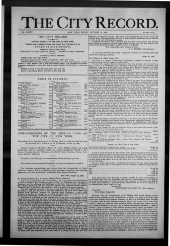The City Record newspaper publishes notices which includes but is not limited to: public hearings and meetings, public auctions and sales, solicitations and awards and official rules proposed and adopted by city agencies. This is the City Record Newspaper for October 19, 1906.