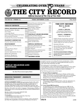 The City Record newspaper publishes notices which includes but is not limited to public hearings and meetings, public auctions and sales, solicitations and awards and official rules proposed and adopted by city agencies.