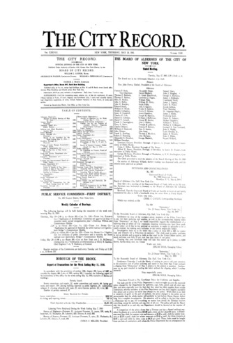The City Record newspaper publishes notices which includes but is not limited to: public hearings and meetings, public auctions and sales, solicitations and awards and official rules proposed and adopted by city agencies. This is the City Record Newspaper for May 19, 1910.