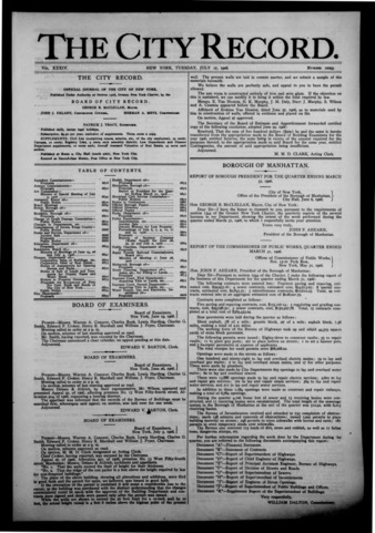 The City Record newspaper publishes notices which includes but is not limited to: public hearings and meetings, public auctions and sales, solicitations and awards and official rules proposed and adopted by city agencies. This is the City Record Newspaper for July 17, 1906.