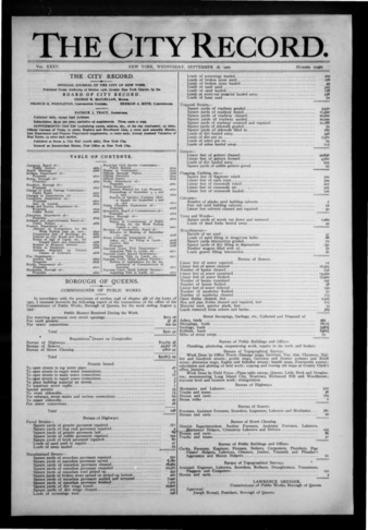 The City Record newspaper publishes notices which includes but is not limited to: public hearings and meetings, public auctions and sales, solicitations and awards and official rules proposed and adopted by city agencies. This is the City Record Newspaper for September 18, 1907.