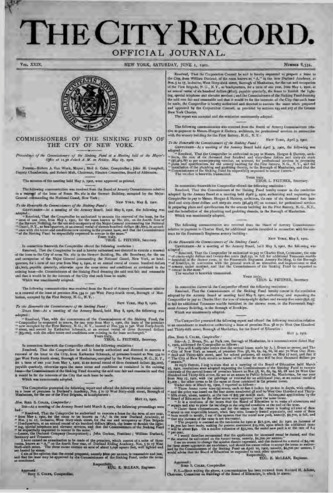 The City Record newspaper publishes notices which includes but is not limited to: public hearings and meetings, public auctions and sales, solicitations and awards and official rules proposed and adopted by city agencies. This is the City Record Newspaper for June 01, 1901.