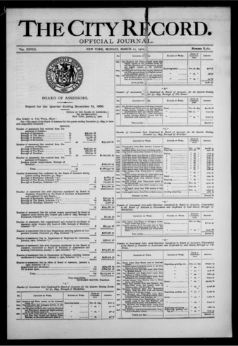 The City Record newspaper publishes notices which includes but is not limited to: public hearings and meetings, public auctions and sales, solicitations and awards and official rules proposed and adopted by city agencies. This is the City Record Newspaper for March 12, 1900.