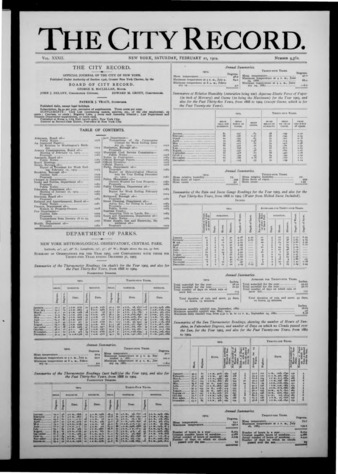 The City Record newspaper publishes notices which includes but is not limited to: public hearings and meetings, public auctions and sales, solicitations and awards and official rules proposed and adopted by city agencies. This is the City Record Newspaper for February 20, 1904.