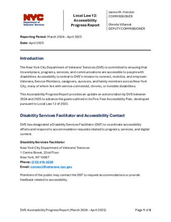 This Five-Year Accessibility Plan describes the steps the New York City Department of Veterans’ Services (DVS) is currently taking and will take over the next five years to ensure workplace, services, programs, and activities are accessible to all.