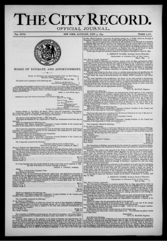 The City Record newspaper publishes notices which includes but is not limited to: public hearings and meetings, public auctions and sales, solicitations and awards and official rules proposed and adopted by city agencies. This is the City Record Newspaper for June 03, 1899.