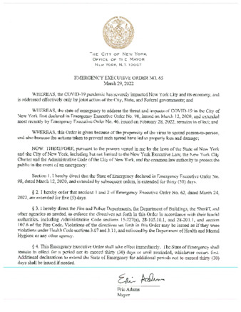 Emergency Executive Order Order No. 65, extends Emergency Executive Order 62, dated March 24, 2022, for five (5) days. If this relates to Athletes and Performers in the Covid-19 pandemic.