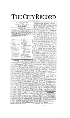 The City Record newspaper publishes notices which includes but is not limited to: public hearings and meetings, public auctions and sales, solicitations and awards and official rules proposed and adopted by city agencies. This is the City Record Newspaper for August 09, 1910.