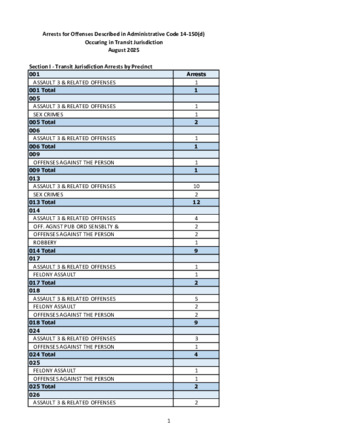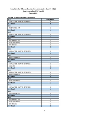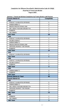 Pursuant to Admin Code Sect. 14-150(d), this monthly report contains information on complaints and arrests for violent felony offenses, assault, sex offenses, disorderly conduct, harassment, aggravated harassment, and offenses against public sensibilities that occurred in transit
