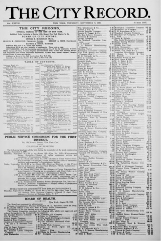The City Record newspaper publishes notices which includes but is not limited to: public hearings and meetings, public auctions and sales, solicitations and awards and official rules proposed and adopted by city agencies. This is the City Record Newspaper for September 09, 1909.
