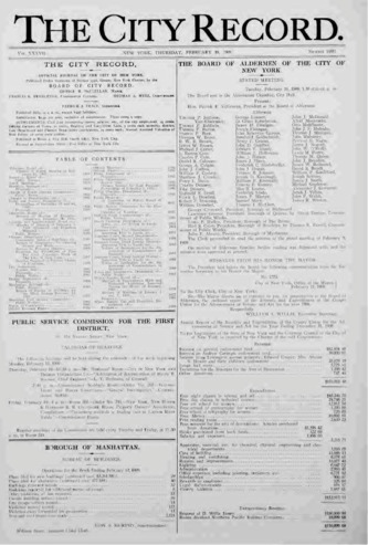 The City Record newspaper publishes notices which includes but is not limited to: public hearings and meetings, public auctions and sales, solicitations and awards and official rules proposed and adopted by city agencies. This is the City Record Newspaper for February 18, 1909.