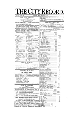 The City Record newspaper publishes notices which includes but is not limited to: public hearings and meetings, public auctions and sales, solicitations and awards and official rules proposed and adopted by city agencies. This is the City Record Newspaper for November 05, 1915.