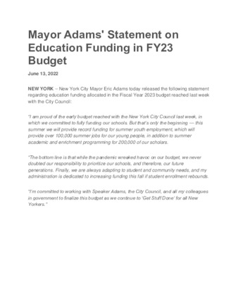 Mayor Adams' Statement on Education Funding in FY23 Budget