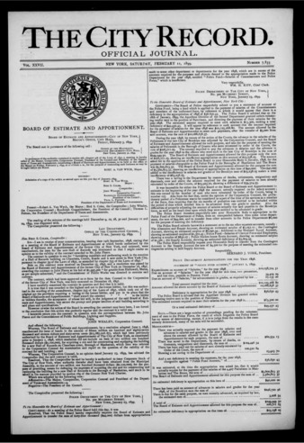 The City Record newspaper publishes notices which includes but is not limited to: public hearings and meetings, public auctions and sales, solicitations and awards and official rules proposed and adopted by city agencies. This is the City Record Newspaper for February 11, 1899.