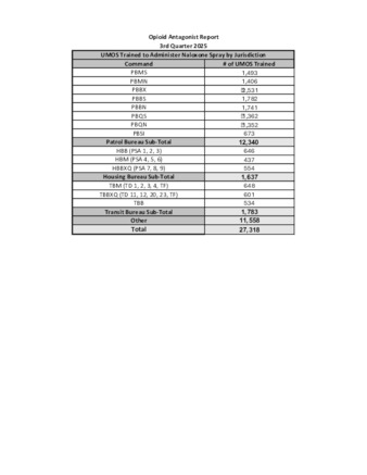 Pursuant to Admin Code Sect. 14-176, this quarterly report contains information on the # of opioid antagonists the dept has available, the # of officers trained to administer opioid antagonists, and the # of times the dept administered an antagonist to an overdose victim, disaggregated by borough