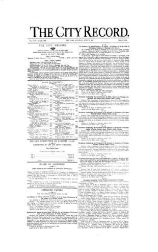 The City Record newspaper publishes notices which includes but is not limited to: public hearings and meetings, public auctions and sales, solicitations and awards and official rules proposed and adopted by city agencies. This is the City Record Newspaper for April 27, 1918.