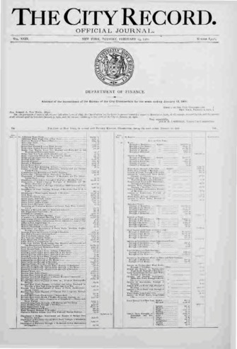 The City Record newspaper publishes notices which includes but is not limited to: public hearings and meetings, public auctions and sales, solicitations and awards and official rules proposed and adopted by city agencies. This is the City Record Newspaper for February 19, 1901.