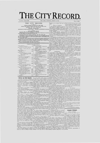 The City Record newspaper publishes notices which includes but is not limited to: public hearings and meetings, public auctions and sales, solicitations and awards and official rules proposed and adopted by city agencies. This is the City Record Newspaper for August 21, 1913.