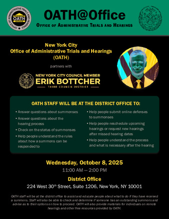 OATH staff were at the district office to assist and educate people about what to do should they have received a summons and to check to determine if someone has an outstanding summons. Materials about remote hearings and other free resources were provided to the public as well.