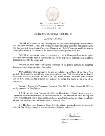 Emergency Executive Order No. 2.3, is being submitted to extend Emergency Executive Order No. 2.2, dated January 15, 2026 for five (5) days as it relates to the state of emergency the City has operated Humanitarian Emergency Response and Relief Centers to provide temporary housing.