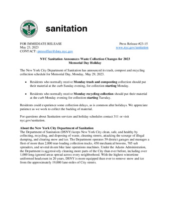 - NYC Sanitation Announces Waste Collection Changes for 2023 Memorial Day Holiday